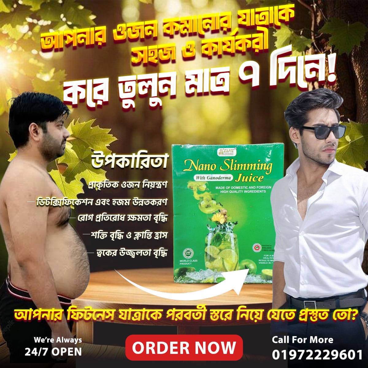 Nano Ginger Juice Slimming Juice হল একটি প্রাকৃতিক ওজন নিয়ন্ত্রণকারী পানীয়, যা উচ্চ মানের আদা নির্যাস দ্বারা তৈরি। এটি মেটাবলিজম বাড়ায়, ফ্যাট বার্ন করতে সাহায্য করে এবং হজমের উন্নতি করে। এই সতেজ ও শক্তিদায়ক জুসটি ফোলাভাব কমাতে, ক্ষুধা নিয়ন্ত্রণ করতে এবং স্বাস্থ্যকরভাবে ওজন কমাতে সহায়ক। অ্যান্টিঅক্সিডেন্ট ও পুষ্টি উপাদানে সমৃদ্ধ, এটি ডিটক্সিফিকেশন ও সামগ্রিক সুস্থতা নিশ্চিত করে।