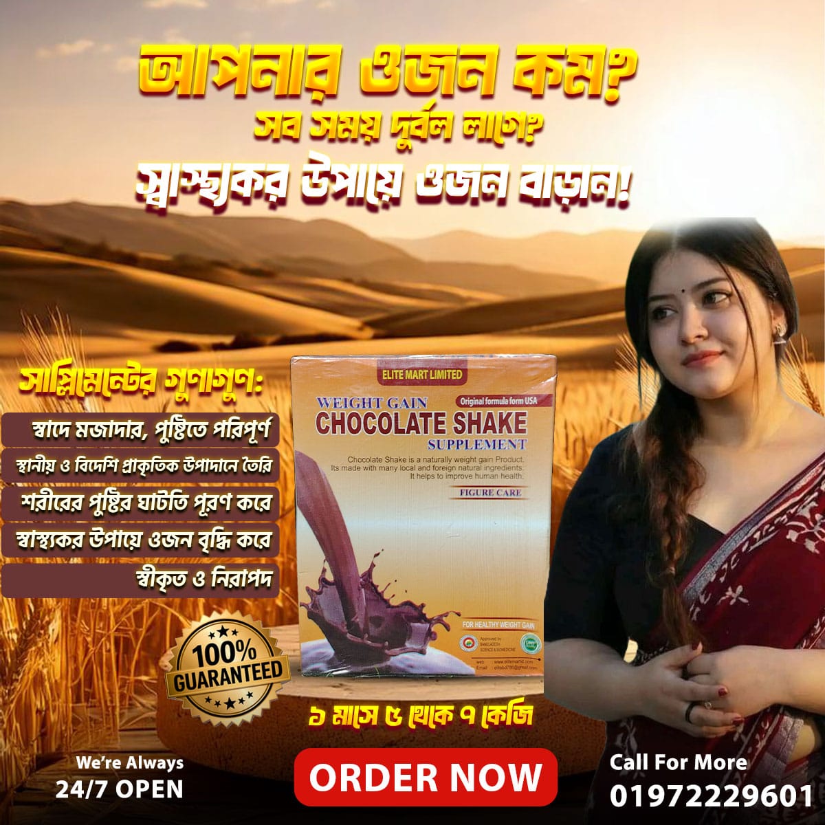 Weight Gain Chocolate Shake দিয়ে স্বাস্থ্যকরভাবে ৫–৭ কেজি পর্যন্ত ওজন বাড়ান। সুস্বাদু, পুষ্টিতে পরিপূর্ণ এবং ১০০% নিরাপদ ও গ্যারান্টেড।