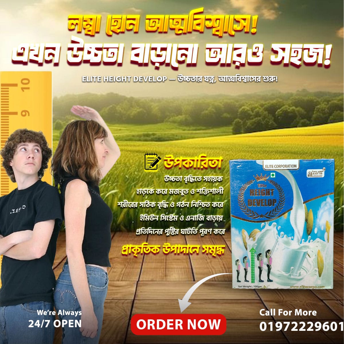 Elite Corporation Height Develop একটি প্রাকৃতিক উপাদান দিয়ে তৈরি হাইট ডেভেলপ পাউডার, যা উচ্চতা বৃদ্ধিতে সহায়ক। এটি শরীরের গ্রোথ হরমোন বৃদ্ধি করে এবং ভিটামিন, ক্যালসিয়াম ও ম্যাগনেসিয়ামের ঘাটতি পূরণ করতে সাহায্য করে, ফলে ৩–৪ ইঞ্চি পর্যন্ত উচ্চতা বৃদ্ধি লক্ষ্য করা যেতে পারে।